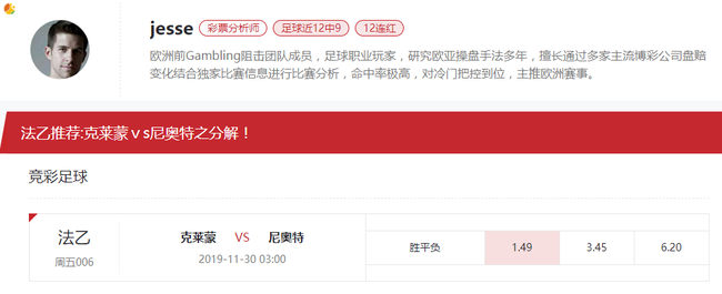 本场欧指即时主胜赔率降低至1.62以内,对主队打出信心倍增亚指初指给出主让半一中水,高水不等,初指优势明显,后市水位降至低水,客队热度升至高水,目前两队现状不相上下比较堪忧,即时**是机构对主队信心倍增的表现,综合全部的信息,本赛预测主队克莱蒙能穿盘凯旋而归。