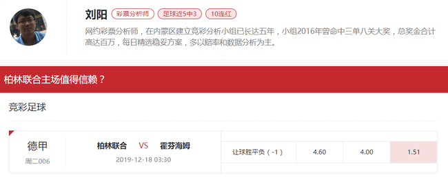柏林联合上场比赛做客战平对手,球队各项赛事两场比赛保持不败,球队近期的走势呈现持续稳定的态势,球队上下士气受到极大的鼓舞,而且需要注意的是,球队在主场的表现也是相当的出色,球队具备超强的主场气势;霍芬海姆上场比赛主场完败对手,球队各项赛事四场比赛未尝胜绩,球队近期的走势呈现持续低迷的态势,球队上下士气受到严重打击,而且需要注意的是,球队做客的表现相当的不俗,球队做客能力值得一捧。