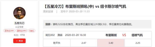 周五002 澳洲甲 [4]布里斯班狮吼(中) vs 纽卡斯尔喷气机[9]