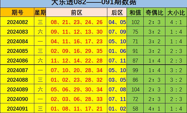 大乐透24092期 预测本前区和值在95-100区间内。