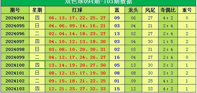 双色球第2024103开奖奖号:红球12、21、23、27、32、33,蓝球15。龙头12,凤尾33,奇偶比4:2,开出1枚重号。