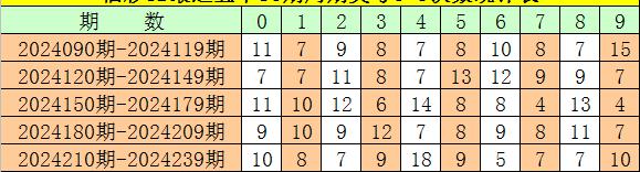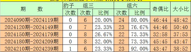 在最近一个30期周期内(第2024210期-第2024239期),组三(含豹子)号码共出现7期,占开奖总数的28%,组六奖号共出现23期,开出比例为92%,组六号码连续出现10期,表现非常活跃,本期预计奖号为组六号码。