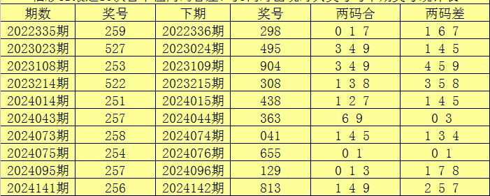 百十位合差分析:上期奖号百十位开出52组合,两码合为7,两码差为3,最近10次百十位两码合7与两码差3同时出现时,其奖号和下期奖号分别为:
