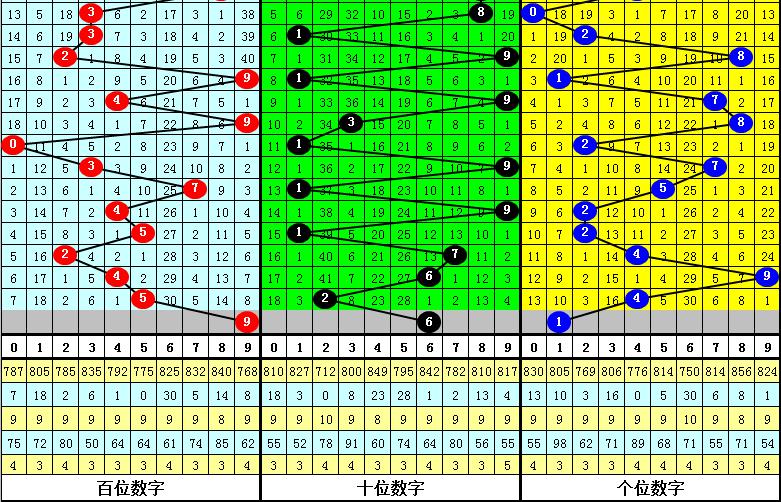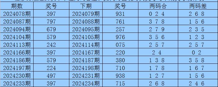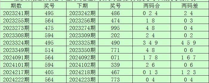 从以上统计可以看出,百十位两码合差7与3同时出现之后其下期两码合差表现最热的4个分别为:1345,本期百十位两码合差可以参考这四码中的数据。