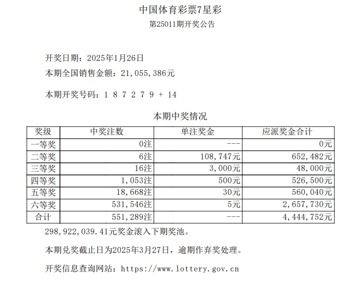 7星彩第25011期二等奖开出6注 奖金108,747元 发表于:2025-02-06 11:28:48 浏览次数:0 2025年1月26日晚,中国体育彩票7星彩第25011期开奖,当期开奖号码为前区“1 8 7 2 7 9”,后区“14”。开奖号码中,前区奇偶比为4:2,大小比为4:2,后区奖号为热号,前区最大号码为“9”,最小号码为“1”。 当期销量为21,055,386元。一等奖空开。二等奖开出6注,单注奖金108,747元。计奖后奖池金额2.98亿元。 上一篇:福彩3D25027期新版藏机图 下一篇:双色球25011期头奖6注944万落4地 奖金944万余元 推荐文章