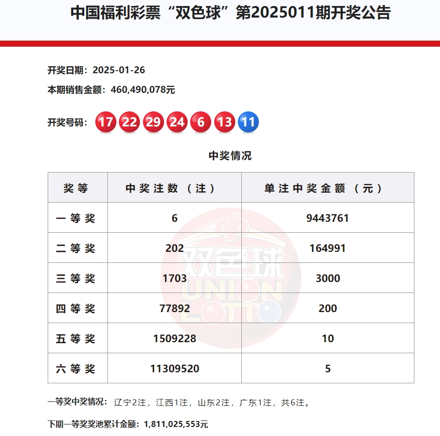 双色球25011期头奖6注944万落4地 奖金944万余元 发表于:2025-02-06 11:29:48 浏览次数:0 1月26日晚,中国福利彩票双色球游戏第2025011期开奖,本期双色球开奖号码为 红球:17 22 29 24 06 13 蓝球:11 本期一等奖开出6注,单注奖金944万余元,6注头奖分落4地,其中辽宁、山东各中出2注,江西、广东各1注;二等奖爆202注16.4万余元。本期双色球全国销量为4.6亿元,计奖结束后奖池余额为18.1亿余元。 上一篇:7星彩第25011期二等奖开出6注 奖金108,747元 下一篇:排列五25027期 容若哥体彩排列五号码分析,附地毯式轰炸 推荐文章