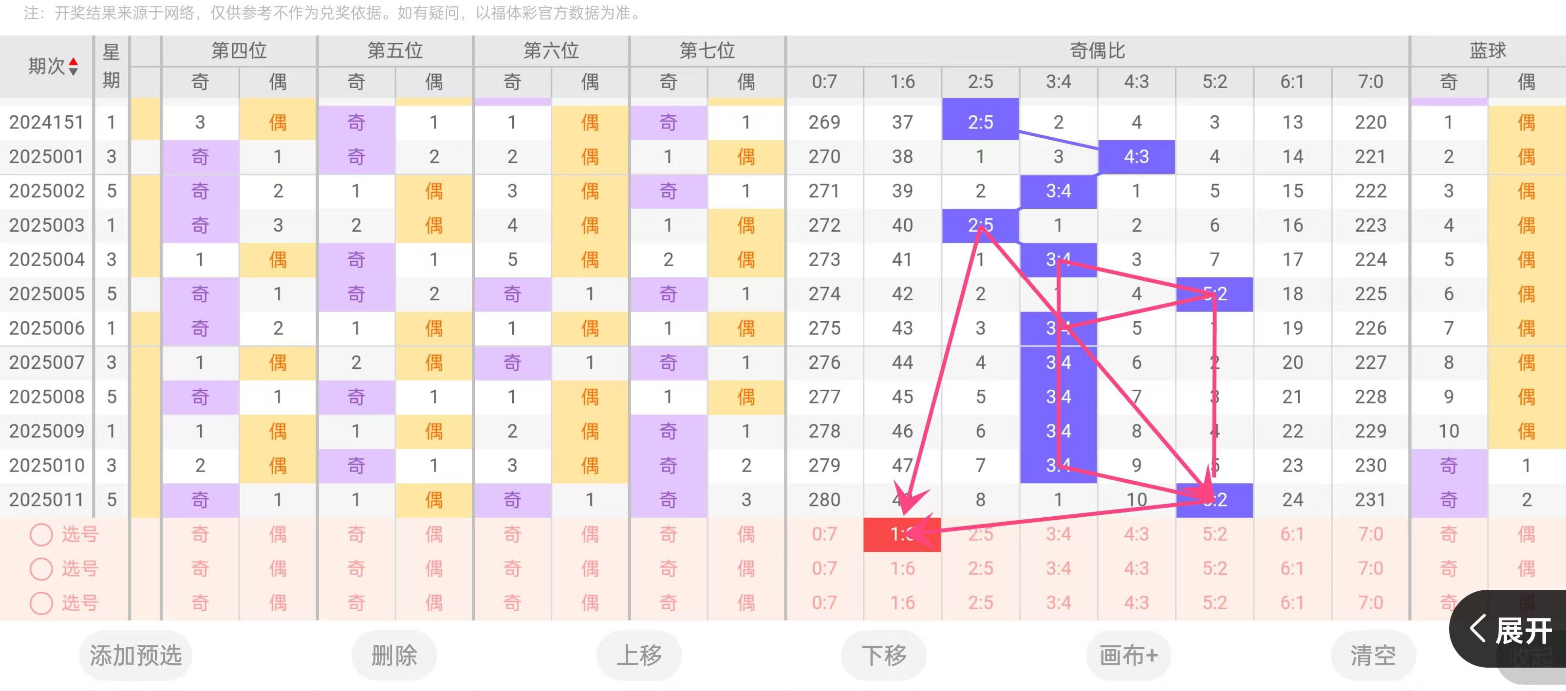 我分析得七乐彩中蓝色特殊号码不考虑。图中是为彩网七乐彩开奖号码奇数偶数比,我在图中标记猜测下期开奖号出现1个奇数6个偶数形态,因为2025004期到2025006期它们组成等腰三角走势,而25006期到最新得25011期组成等腰梯形走势,由稳定图形到不稳定图形,因为不稳定,所以等腰三角形与等腰梯形附近不会在落在下期得时候,而图中叫我标记得箭头有三角走势,符合我的猜测。接下来根据为彩网走势图分析肯可能落得红球。