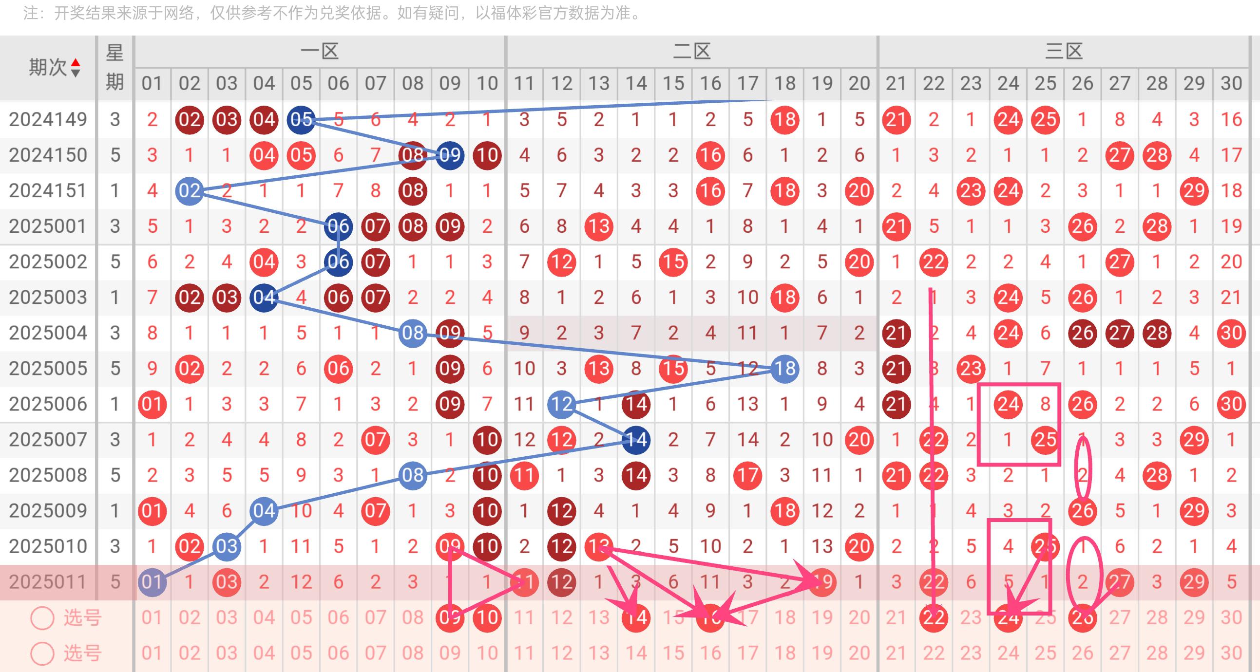 我分析得七乐彩中蓝色特殊号码不考虑。根据为彩网图知道,上期开奖号是【0,11,12,19,22,27,29】,由为彩网走势图知道上期重复号一个没有,并且近5期图中一区,二区,三区都有数字,所以下期也不会在某一个区出现没有号得情况,因为近5期没有断区不落号得趋势。分析根据数学平均数计算知道上期热号冷号比列相当,这种情况得趋势我猜测下期会有一个重复号出现,前文分析奇数偶数比是1:6,也就是下期可能出现1个奇数,我猜测下期奇数会出现红球数字9,因为在标记图中红球数字9具有三角走势,而六个偶数我分别选得【10,14,16,22,24,26】,数字10我根据2025008期组合10,11补充回补得10,比较好看,数字14是根据图中标记25010期12,13组合与25009期到25011期落号12得等边三角形走势得补充,数字16是根据图中13-19-16他们同路(都是1路数)并且数学加法运算原则他们相差6和3,存在倍数关系,容易出现这个趋势,数字22是根据图中25002期与25011期他们落号间隔分别是4和2,存在数学倍数关系,容易出现这个趋势,数字24根据图中标记矩形区域处,它们对称得补充,对称趋势回补趋势会比较容易出,数字26根据2025006期与2025009期他们得落号间隔都是2,这种相等得趋势比较容易出现。最终基础号码7个在大总结中给出。