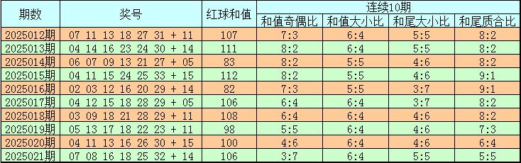 和值跨度分析:上期和值开出106,对比第2025020期和值上升了6个点位,本期预计和值在大号区域热出,看好出现在97附近。