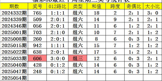奖号类型分析:从近期周三开奖数据分析,组六近期热出,十周内出现9次,上周三为组六号码,组三出现1次,表现相对较冷,本周三预计继续开出组六号码。