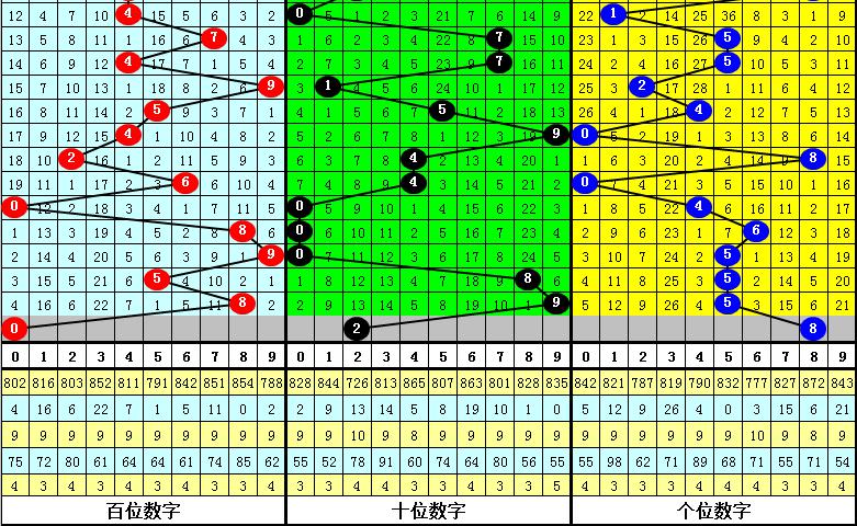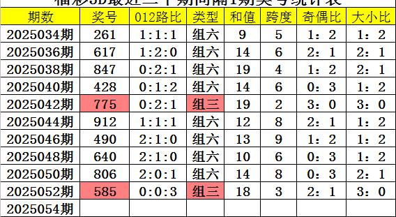 跨度分析:最近周三跨度出现范围在2-9区间,跨度比较集中,上周三跨度为6,跨度重复开出,本期看好跨度上升,参考跨度8。