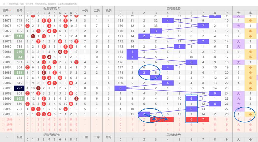 通过观察跨度及跨度属性走势可以发现:近10期内跨度小数号码出号后,下期容易连开小数号码,上期跨度开出了小数号码2,本期跨度大概率仍会开出小数号码,因此本期跨度应该考虑小数号码出号,防大数号码;再结合上述走势图看,本期跨度看好3467等号码。