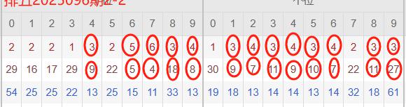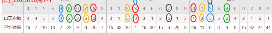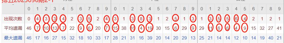 下图所圈出的为近30期各位置所出现的热码出现次数及平均遗漏值,用以参考和一些冷码组合选号。