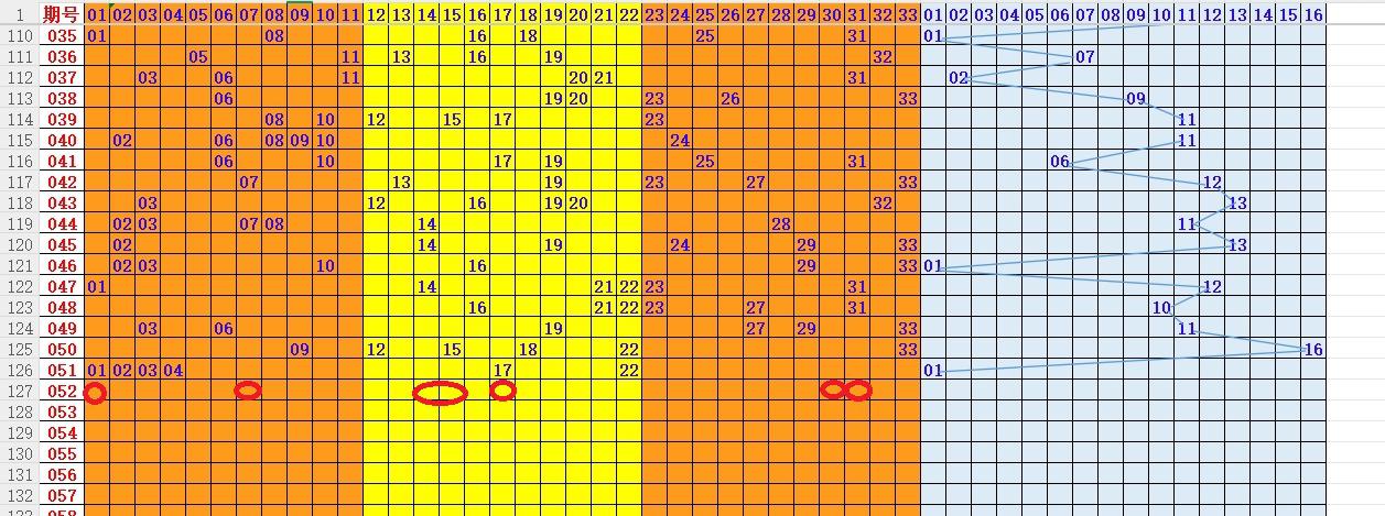 如上图1,区域分析,第一区最低出2个号,重点号码: 01 07