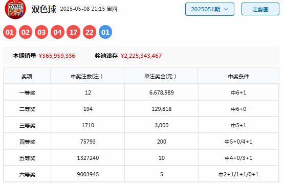双色球第2025051期开出奖号为01、02、03、04、17、22+01。其中红球奇偶比为3:3,三区比为4:2:0,大小比为2:4,蓝球开出小 号01。