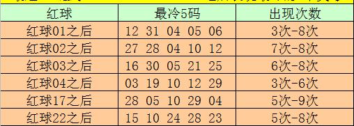 红球冷码统计:双色球第2025051期开出红球奖号分别为:01、02、03、04、17、22,在最近300期开奖中,各号码出现之后其下期出现最少的5个红球分别为:
