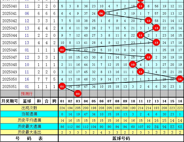 上期开出蓝球号码01,该号码在最近300期中出现了17次,其下期分别开出:蓝球03、07、12、15、16出现2次,蓝球01、04、05、06、08、09出现1次,蓝球02、10、11、13、14出现0次。本期五码蓝球参考03、05、14、15、16,独蓝关注03。
