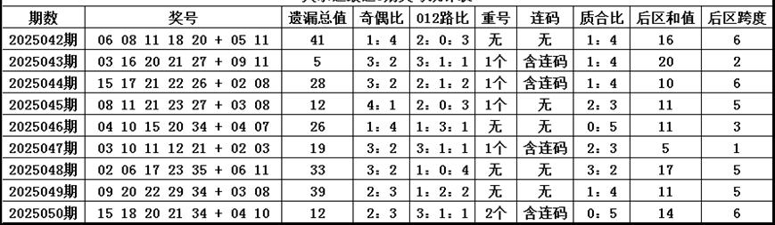后区跨度:后区近9期跨度分别开出6-2-6-5-3-1-5-5-6,跨度奇偶比为5:4,上期跨度上升1个点位,本期防跨度转向下降,看好开出偶数跨度,参考跨度4。