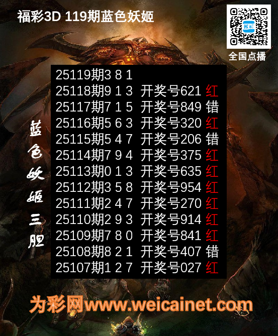 福彩3D25119期胆码 蓝色妖姬胆码图