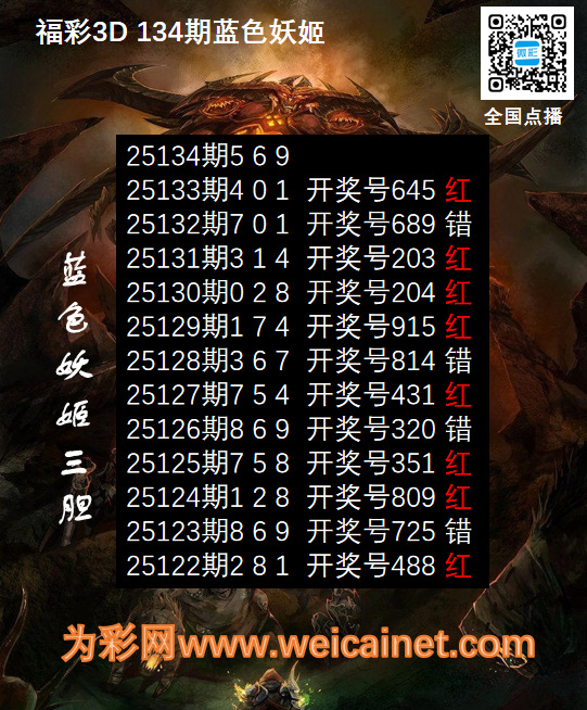 福彩3D25134期胆码 蓝色妖姬胆码图