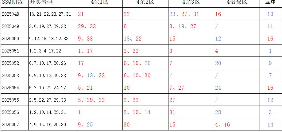 分享第一个数据分析:四分区统计数据。相对于传统的三分区,个人习惯使用四分区,就是把33个红球号码除以4,所得的余数分区如下: