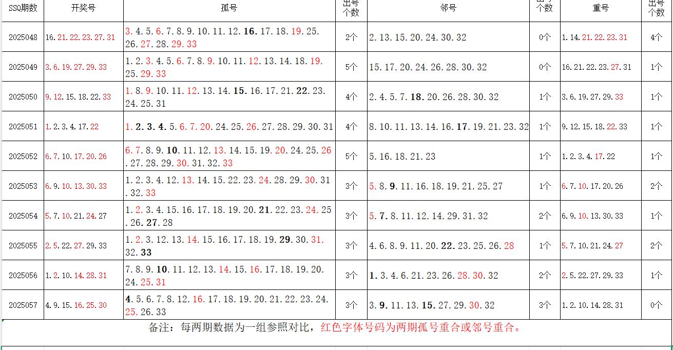 如图,以近两期数据为一组,进行对比分析。相同的孤号、邻号,可能在下期开出1-4个左右。上期孤号开出3个,邻号开出3个,重号0个。本期参考孤号:1.2.6.7.11.12.13.18.19.20.21.22.23.27.28.32.33;邻号:3.5.8.10.14.17.24.26.29.31。孤、邻号重合号码精选:***(会员专区可见)。个人分析,仅供参考。