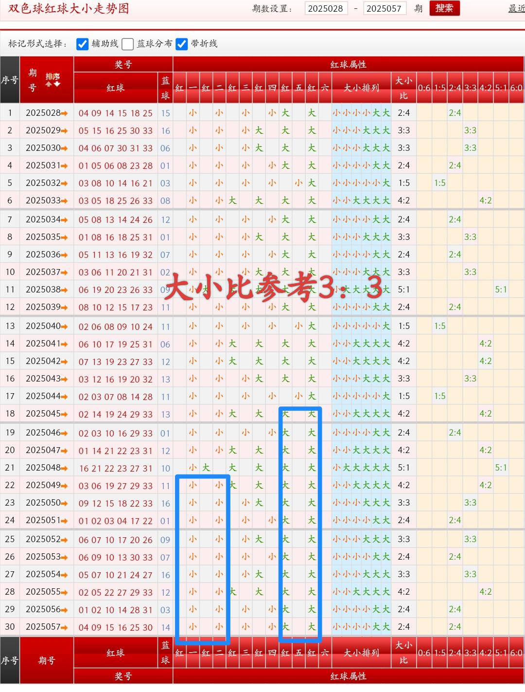 红球大小方面:小数为【01到16】,大数为【17到33】,上期开出大小形态为2:4,小数出号四个,大数出号二个,上期小数出号个数较多较热,本期看好大数回补走热,综合最近30期数据分析形态0:6一次没有出现,形态1:5开出过三次,形态2:4开出过十次,形态3:3开出过八次,形态4:2开出过七次,形态5:1开出过二次,形态6:0一次没有出现,其中形态0:6,形态1:5,形态5:1,和形态0:6这四个形态开出过次数较少属于偏冷状态我们可以不用考虑太多以防为主还是以热形态为主,其中形态2:4开出过次数最多也是最热的需要注意一下,红球第一位和第二位小数出号连续开出九期本期这两个位置继续看好小数出号,红球第一位和第二位,第三位,第四位同为小数出号已经二期本期需要防断开,本期注意第四位大数出号回补,大家需要多参考热的东西冷的东西不要去追,红球第六位大数出号已经30期以上本期继续看好大数,红球第五位和第六位同为大数出号已经十三期本期这两个位置继续看好大数出号,本期要想判断它的大小形态需要通过第三位去看,058期大小方面参考形态3:3