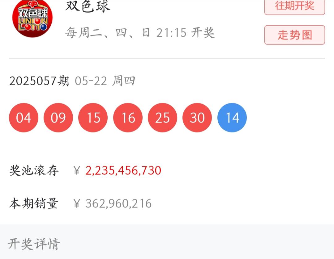 >红球04,09,15,16,25,30蓝球14,其中红球三区比为2:2:2,奇偶比3:3,大小比为2:4,蓝球开出偶数14