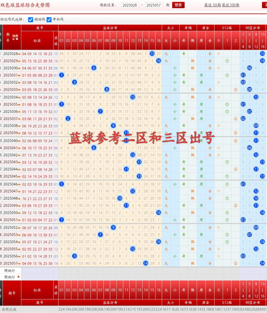 >蓝球方面:上期开出偶数14,2路出号,四区出号,一区【01到04】,二区【05到08】,三区【09到12】,四区【13到16】,本期需要注意蓝球出号在二区和三区中产生