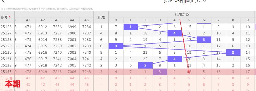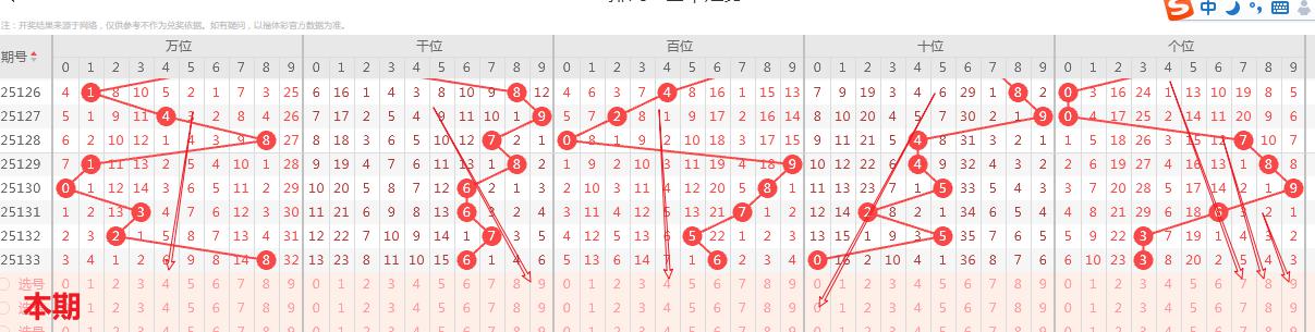 百位分析 上期百位数字是 6,五行属土。土生金,金对应 4、9;土克水,水为 1、6。观察百位数字的历史走势,发现其与五行生克关系存在一定的周期性。在当前阶段,金的力量相对薄弱,需要补充金的能量,因此本期百位推荐数字 4。