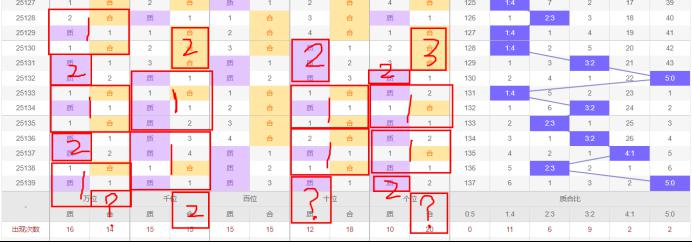 近10期的质合比分别开出了1:4、3:2、5:0、1:4、3:2、2:3、3:2、4:1、2:3、5:0,上期开出5个质数,未见合数,本期合数多半会开出。从质合走势分布图看,有以下特点:1、万位奇偶分布趋势从上往下看,形状有规则的出现,按照当前图像分布,本期倾向于开合数;2、千位呈现对称分布,本期倾向于开合数;3、十位从分布形状来看,也像是对称分布,本期倾向于开质数;5、个位从分布形状来看,也像是对称分布,本期倾向于开合数。