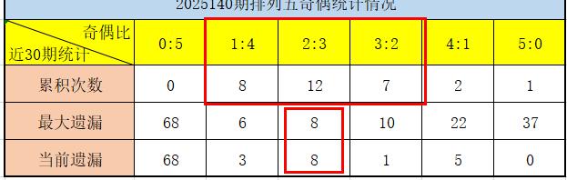 从近30期的奇偶统计来看,奇偶比的出现主要集中在【1:4】【2:3】【3:2】,次数累积出现27次,占整体的90%,是奇偶比出现的主要落点,于此同时,【2:3】近30期出现12次,占比40%,已经连续8期未开出,本期可能开出,可以重点关注。