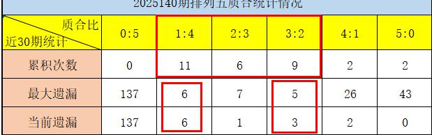 从近30期质合比的统计来看,质合比的出现主要集中在【1:4】【2:3】【3:2】,次数累积总共出现26次,占整体的86.7%,是近期质合比出现的主要落点,本期可以继续关注,而且近30期【1:4】的表现不错,但是目前处于最大遗漏,本期可以重点关注。