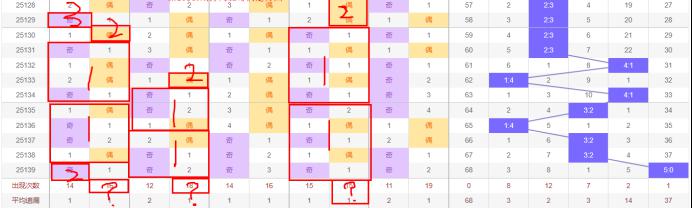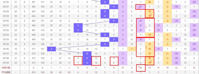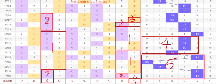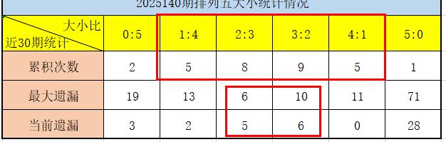 从近30期大小比的统计来看,大小比的出现主要集中在【1:4】【2:3】【3:2】【4:1】,其中【2:3】和【3:2】的次数累积出现17次,占整体的56%,是大小比出现的主要落点,近期表现不错,但当前遗漏次数偏大,本期开出的机会较大,可以重点关注。