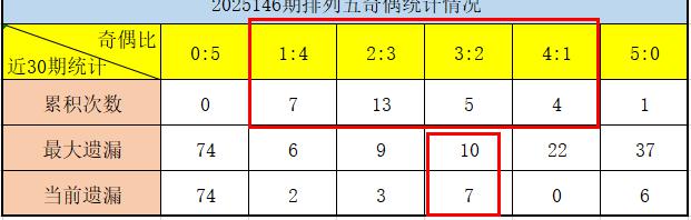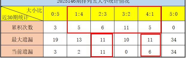 从近30期的奇偶统计来看,奇偶比的出现主要集中在【1:4】【2:3】【3:2】【4:1】,次数累积出现29次,占整体的96.7%,是奇偶比出现的主要落点,于此同时,【4:1】近期出现次数占比正在逐渐上升,需要关注,【3:2】当前处于一个较大的遗漏值中,本期可以关注。