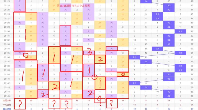 从大小的走势分布图来看:1、万位的分布形状以25135期和25136期作为轴线,上下形状形成对称,如果继续按照当前分布趋势,本期倾向于开大号;2、千位从第25134期开始,大小开出的形状就开始成规律下行,如果按照趋势,本期大号连开的机会较小,趋向于开小号;3、百位的分布形状以25139期和25140期中线为轴线,上下形状形成对称,如果继续按照当前分布趋势,本期倾向于开大号;4、十位以第25140期和第25141期为起点,上下形状呈对角分布,按照当前形状趋势,本期趋向于小号;5、个位的分布形状以25140期为轴线,上下形状形成对称,按照当前分布趋势,本期倾向于开大号。