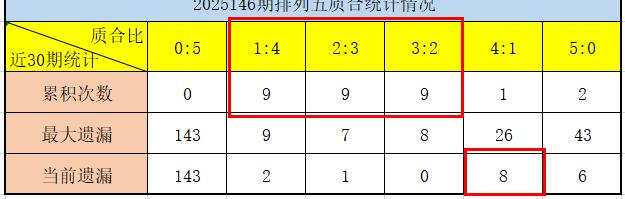 从近30期质合比的统计来看,质合比的出现主要集中在【1:4】【2:3】【3:2】,次数累积总共出现27次,占整体的90%,是近期质合比出现的主要落点,近期这三个落点共计次数一直处在27次,比较稳定,本期可以继续关注。