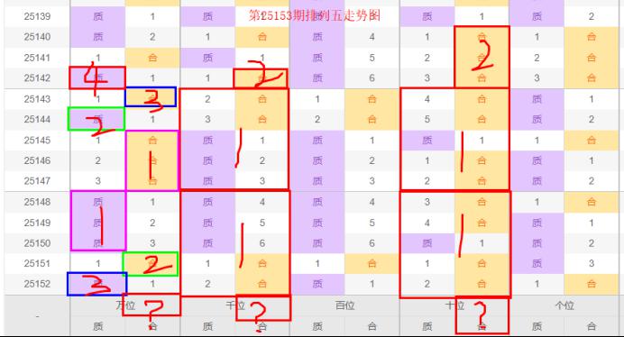 从质合走势分布图看,有以下特点:1、万位的分布形状呈现以第25147期和第25148期的中线为轴线,上下分布形状对角对称,按照这趋势,本期万位趋向于开合数;2、千位的分布形状以第25147期和第25148期中线为轴线,上下呈现对称分布,按照这趋势,本期趋向于开合数;3、十位以25147期和25148期中间为轴线,上下分布形状呈现对称,按照当前趋势,本期趋向于开合数。