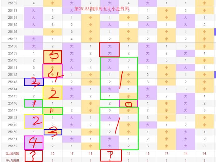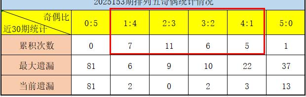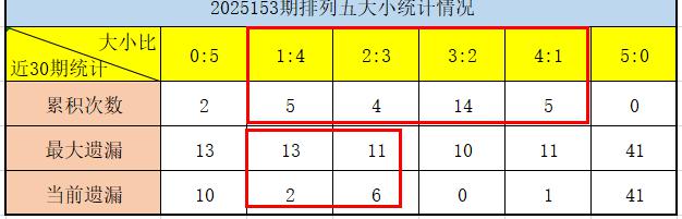 从近30期大小比的统计来看,大小比的出现主要集中在【1:4】【2:3】【3:2】【4:1】,近期大小比之间来回开出,本期可以将重点放在高遗漏的主要落点上,也就是【1:4】【2:3】。