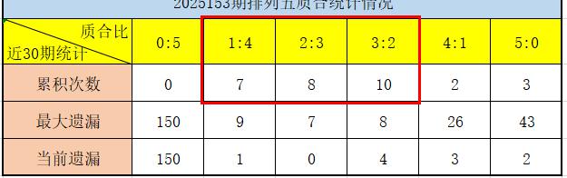 从近30期质合比的统计来看,质合比的出现主要集中在【1:4】【2:3】【3:2】,次数累积总共出现25次,占整体的83.3%,是近期质合比出现的主要落点,而且从近期的结果来看,合数有回补的迹象,所以本期继续关注【1:4】【2:3】。