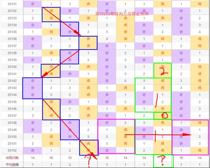 从奇偶走势分布图看,有以下特点:1、万位和千位对角都呈现对角线连接的分布形状,按照这个分布趋势,本期千位趋向于继续连开偶数;2、十位的分布形状呈现以第25147期为轴线,上下分布形状对称,按照这趋势,本期十位趋向于开偶数,3、百位和个位近5期都是开相反的奇偶号码,本期有较大的可能开出同奇或者同偶,从近期偶数有回补的迹象来开,开同偶的机会比较大。