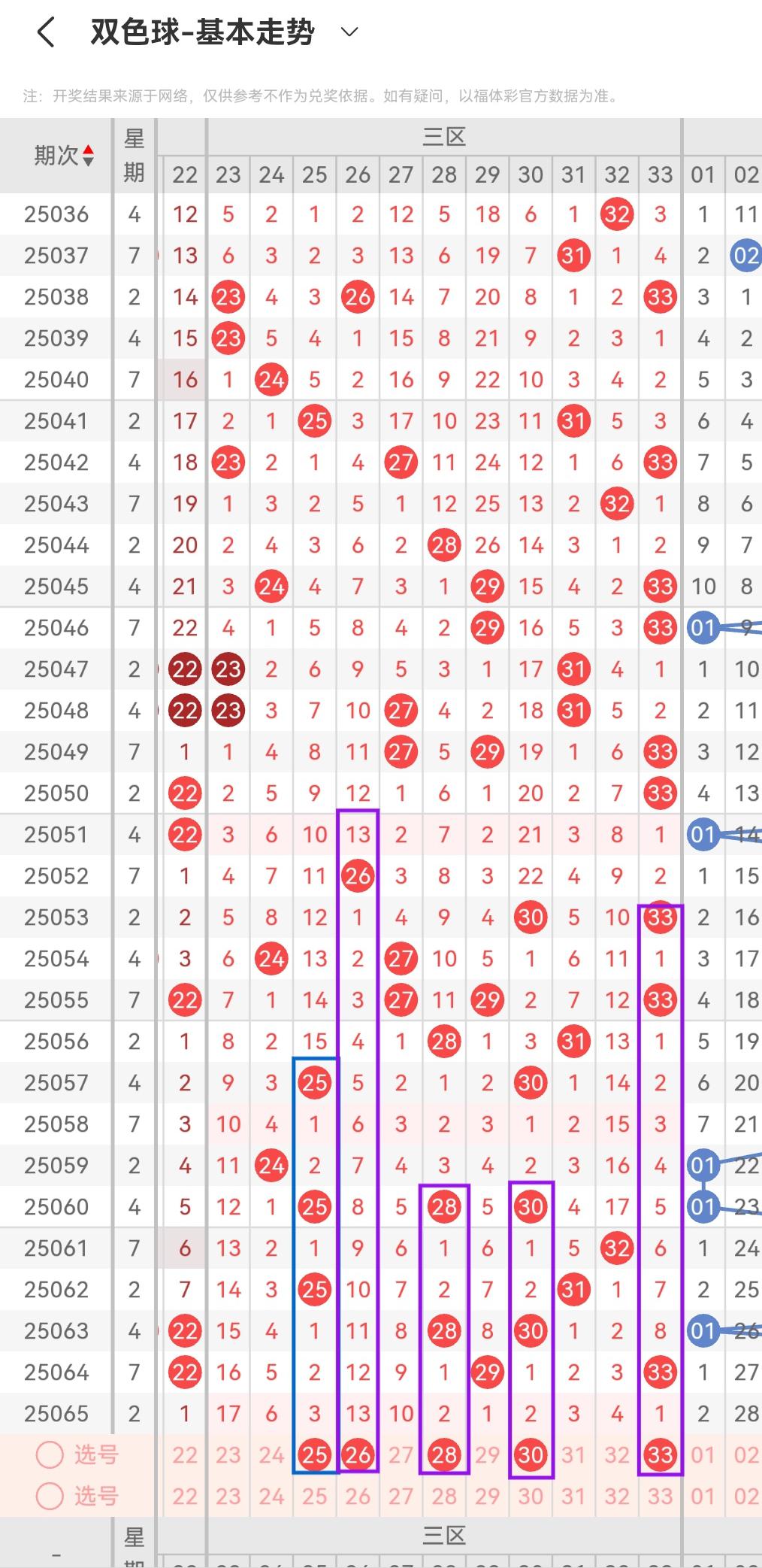>三区间上期(25065期)开出了零码,区间走出了断区走空,本期断区走空下如何回补和能回补几码需要仔细研判考虑,重点关注近期热态和温态号码回补落码,从近期该区间走出断区走空回补来看,在25051期走出断区走空后下期回补了一码,回补了冷态号码,在25058期走出断区走空后下期回补了一码,回补了热态号码,本期首先需要关注的号码【25】三期回补号码,然后是【26】十三期跳空对称形态,其次是【28】和【30】两期跳空对称形态,【33】隔期回补号码带对称形态,本期重点关注号码【25 26 28 30 33】