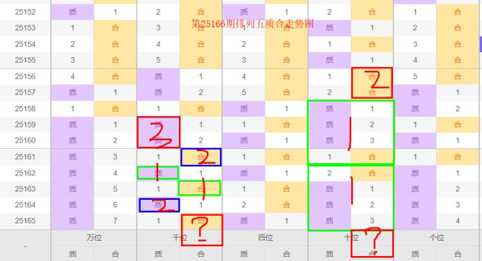 从质合走势分布图看,有以下特点:1、千位的分布形状呈现以第25162期和25163期中线为轴线,上下分布形状形成对角对称,按照这趋势,本期百位趋向于开合数;2、十位的分布形状呈现以第25161期和25162期中线为轴线,上下分布形状形成对称,按照这趋势,本期十位趋向于开合数。