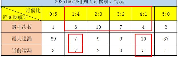 从近30期的奇偶统计来看,奇偶比的出现主要集中在【1:4】【2:3】【3:2】【4:1】,次数累积出现27次,占整体的90%,是奇偶比出现的主要落点,从遗漏来看,当前【1:4】和【4:1】处于 一个较大的遗漏中,可以作为本期的关注点。