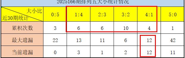 从近30期大小比的统计来看,大小比的出现主要集中在【1:4】【2:3】【3:2】【4:1】,上期开出5个小数,近期小数在回补,数量优势比较明显,本期大数可能会反扑,需要重点关注,而且从遗漏来看,大小比【4:1】当前处于最大遗漏中,本期可以关注大小比【4:1】。