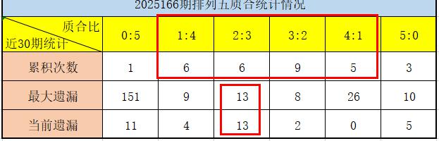 从近30期质合比的统计来看,质合比的出现主要集中在【1:4】【2:3】【3:2】【4:1】,质数持续回补中,上期质数又开出4个,本期可以侧重关注合数,而且【2:3】当前处于较大遗漏,可以重点关注。