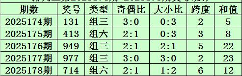 上期回顾:排列三第2025178期开奖号码为714。奖号类型为组六,奇偶比为2:1,大小比为1:2,跨度为6,和值为12。