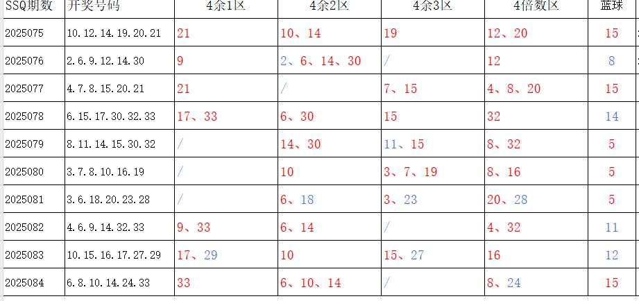 分享第一个数据分析:四分区统计数据。相对于传统的三分区,个人习惯使用四分区,就是把33个红球号码除以4,所得的余数分区如下: