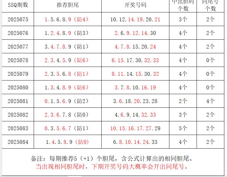 如图,每期推荐胆尾中出1-4个。上期推荐胆尾中出3尾4码!推荐胆尾是按照公式计算的顺序,不定位红球号码的顺序。本期推荐胆尾:4尾/7尾/6尾/9尾/5尾 。加推重点胆尾:***(会员专区可见)。推荐胆码号码:***(会员专区可见)。个人分析,仅供参考。
