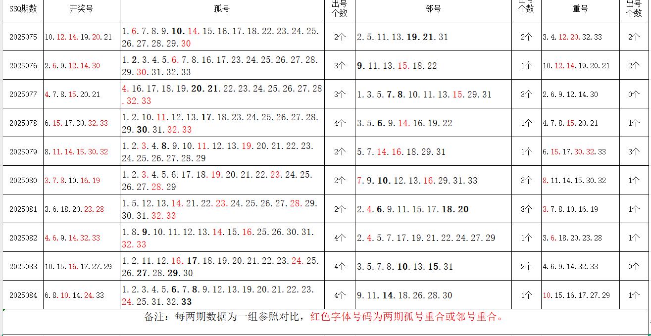 如图,以近两期数据为一组,进行对比分析。相同的孤号、邻号,可能在下期出1-4个左右。上期孤号开出4个,邻号开出1个,重号1个。本期参考孤号:1.2.3.4.12.16.17.18.19.20.21.22.26.27.28.29.30.31;邻号:5.7.9.11.13.15.23.25.32。孤、邻号重合号码精选:***(会员专区可见)。个人分析,仅供参考。